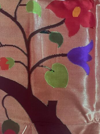 Pratishthani yeola paithani sarees are handwoven using only pure silk threads, without any additional materials. The weaving of pure silk Yeola Paithani saree is a time-consuming process. It takes months or years to complete intricate designs and craftsmanship.